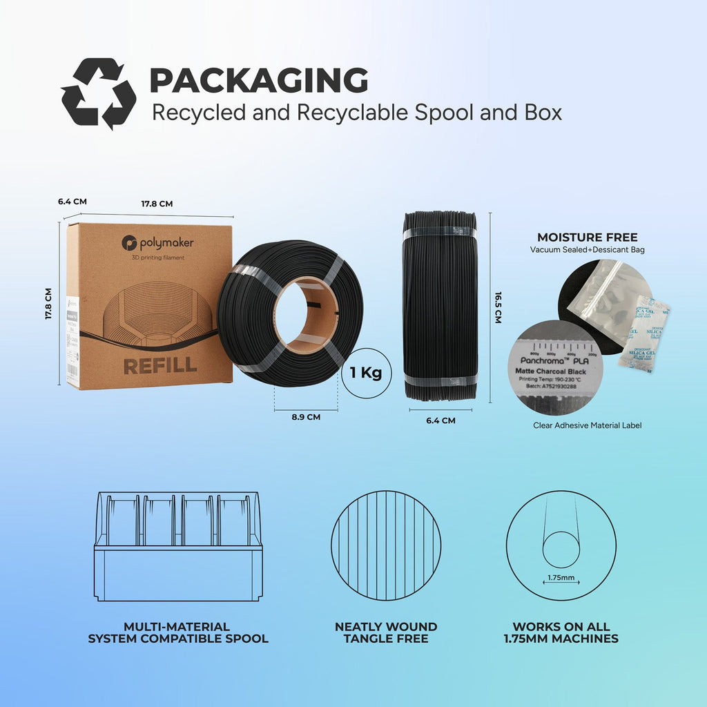 By reusing your spool and minimizing packaging waste, you help reduce plastic consumption while enjoying the same premium Polymaker quality trusted by makers worldwide. Panchroma™ Refill represents the next step in sustainable 3D printing—where beauty, performance, and responsibility align.